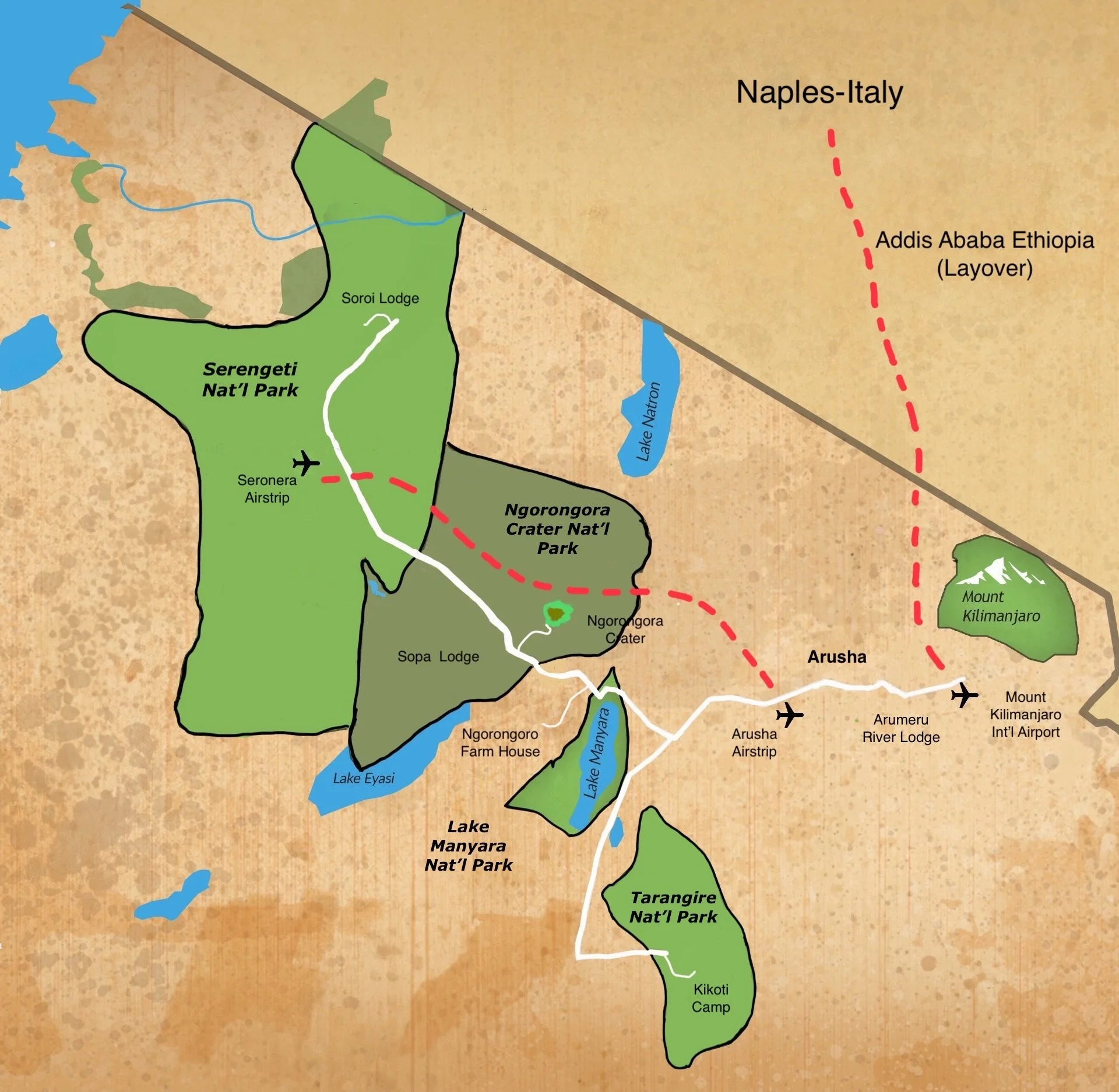 It had been awhile since my cockpit days, so for the last adventure in the Serengeti I got to reminisce about the good ol' days of flying. Karen's warning statement as we taxied, "Don't touch anything!" I landed with a broad smile on my face, the flight capping one of the greatest adventures of my life. We flew to an intermediate airport just outside of Arusha where we were taken to a hotel to freshen up, have some lunch and get a nap before launching on our nearly 24 hours of travel to return to Naples, Italy.