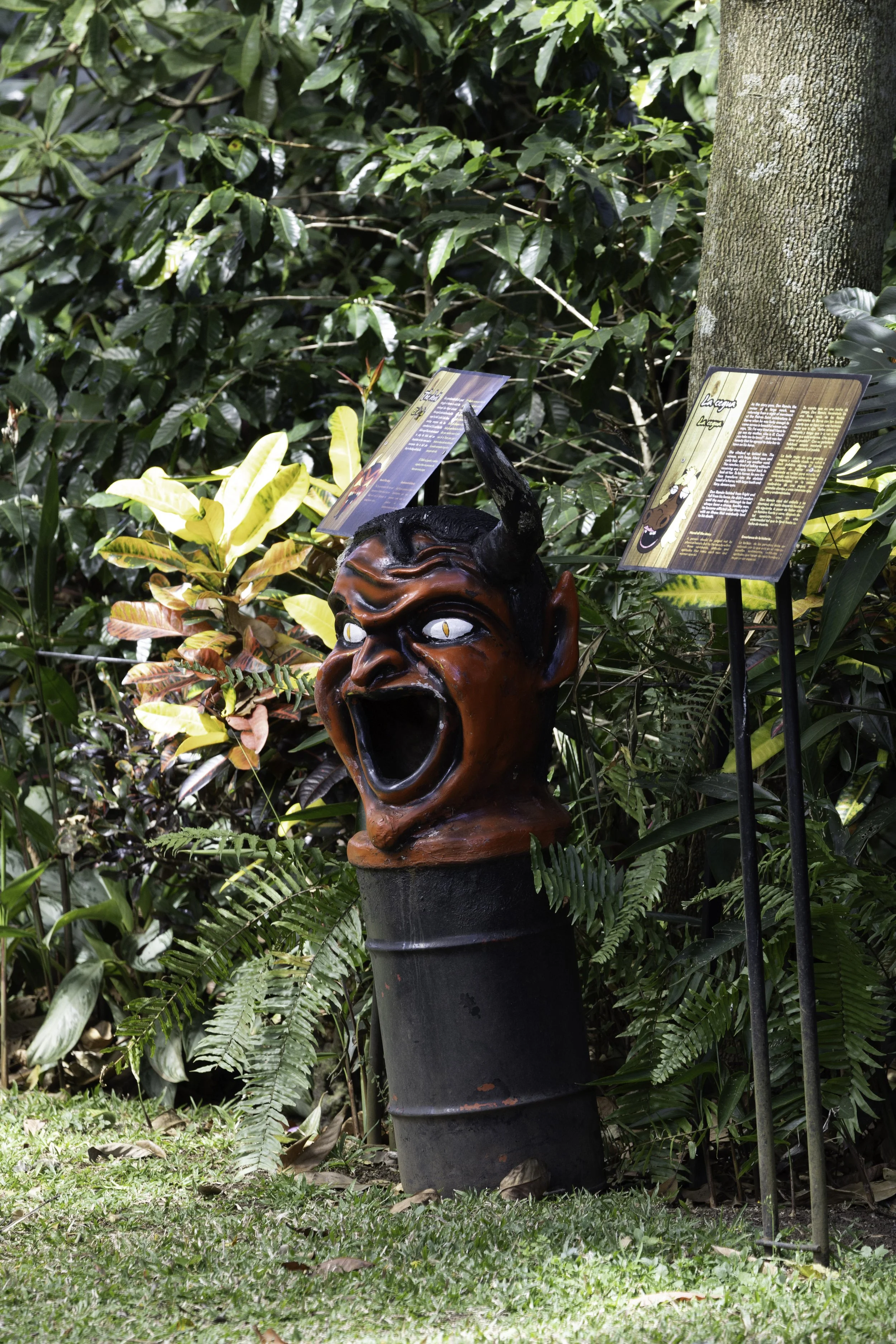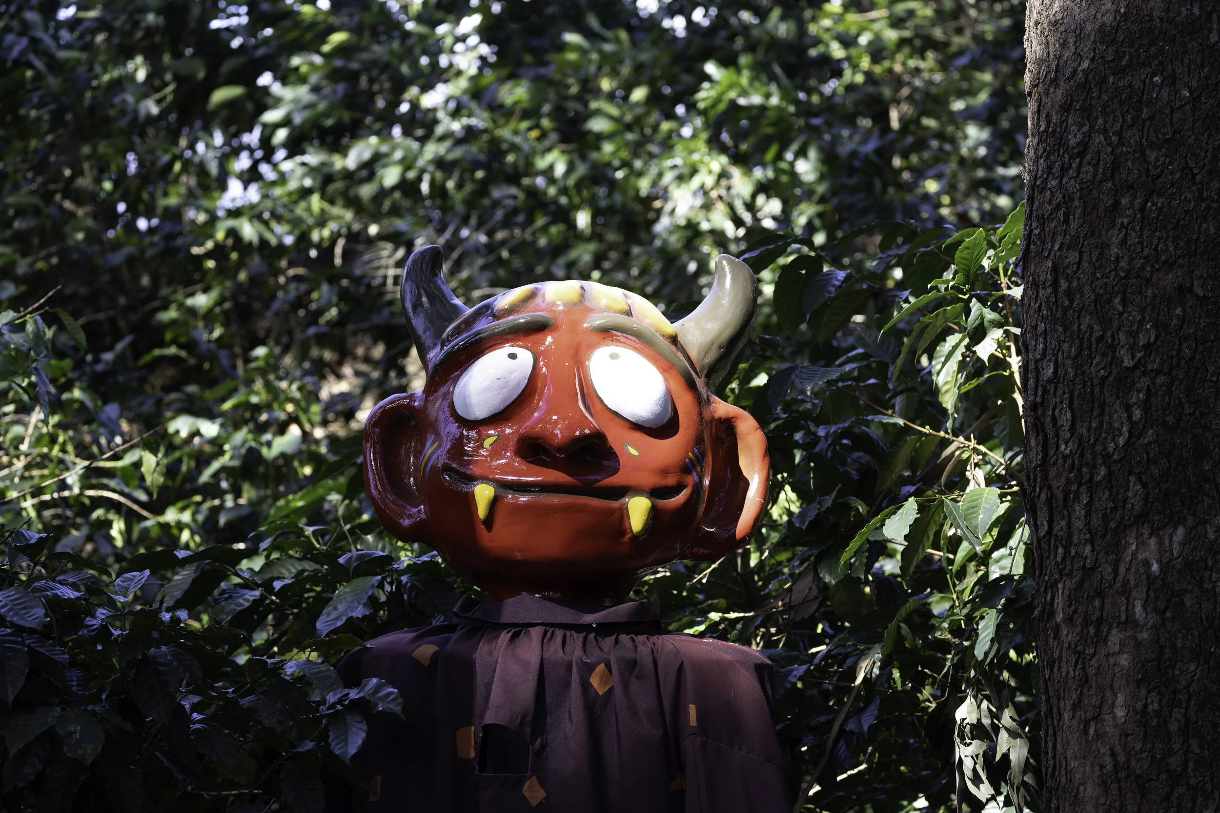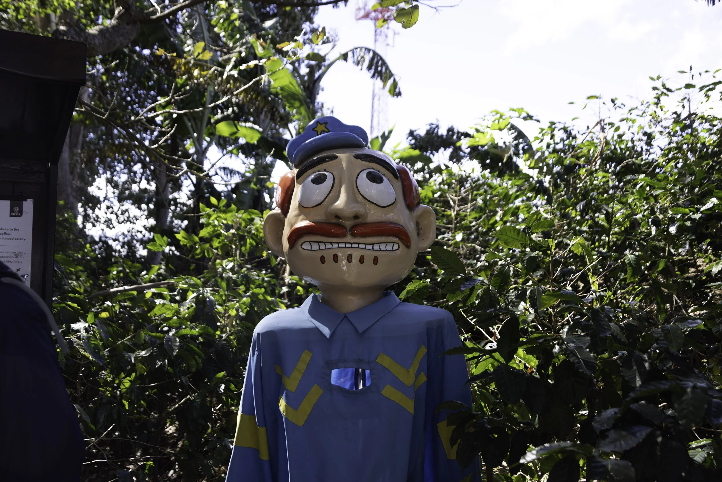 While touring the coffee factory, we stumbled upon a colorful display of Costa Rica’s parade heads—cabezudos or mascaradas—oversized, handmade papier-mâché masks that bring mythical and cultural characters to life as they dance through the streets, especially on the National Day of Masquerades (October 31). Our guide explained that they are crafted by local artisans, these giant masks portray devils, witches, and giants in bold, exaggerated features and bright paints, each one a lively celebration of folklore and national identity. Seeing them amid the rich aroma of roasting beans felt fitting: the masks’ playful, larger-than-life presence echoed the warm, communal spirit of Costa Rican traditions, reminding us how craft, story, and everyday places like a coffee factory intersect to keep culture vibrant.